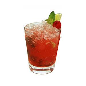 • Muddle lime and mint with one bar spoon sugar. Add remaining ingredients and ice. Stir.